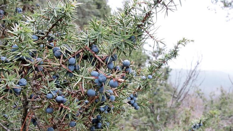 Auf ehemaligen Weinbergen und anderen Magerrasen-Standorten der Region gedeiht der Wacholder gut: Das Zypressengewächs trägt in diesem Jahr besonders üppig Beeren, hier ein Zweig am Hang oberhalb von ...
