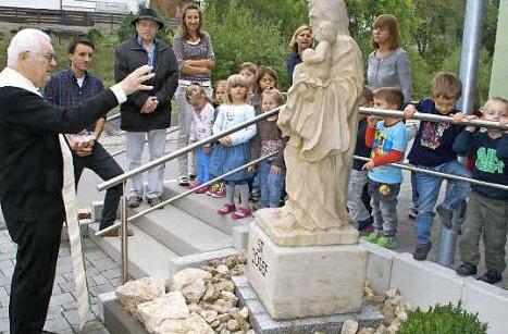 Die Figur, die als Vater den kleinen Jesus auf dem Arm trägt, erhielt von Pfarrer Ewald Thoma den kirchlichen Segen und dem Stifter Josef Heil schallte aus vielen Kinderkehlen ein fröhliches "Danke" entgegen. Vier Wochen lang hatte er an der Josefs-Figur aus Bucher Sandstein gearbeitet.