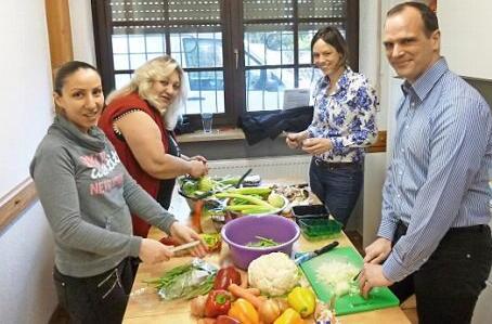 Nun sind sie verantwortlich für das Mittagessen der 30 Ehrenamtlichen. Statt Computertastatur und -maus nehmen sie Messer und Schneidbretter in die Hand, um in Gemeinschaftsarbeit Möhren zu schälen, Salat zu putzen, Zwiebeln zu schneiden und Tomaten zu verkleinern. "Da die Laufer Mühle ja nach Din-Iso zertifiziert ist, halten wir uns freilich auch an die Qualitätsnormen", schmunzelt Martin Wedel und streut den geriebenen Käse über das gegarte Gemüse. Anne Wedel-Klein rührt derweil feine Salatsoßen an und ist freudig angetan von der Hilfsbereitschaft der Ehrenamtlichen, die immer wieder nachfragen, ob zusätzliche Hilfe benötigt wird. Pünktlich zur Mittagszeit versammeln sich alle Ehrenamtlichen im provisorischen Speiseraum und warten auf die Koch- und Backergebnisse. "Es riecht sehr gut, aber ob es auch schmeckt?" wendet sich Anne Wedel-Klein an ihren Cousin Martin. Die Sorge ist unbegründet, nach 30 Minuten sind alle Töpfe und Schüsseln geleert und die Rückmeldungen durchaus positiv, obwohl es heute einmal kein Fleisch gab. "Also das Essen war mal was anderes" meint Peter, der nach getaner Arbeit einen "Mordshunger" hatte und in fränkischer Manier den beiden Köchen mit "passt einwandfrei" das höchste Lob ausspricht, das hier in der Region zu vergeben ist.