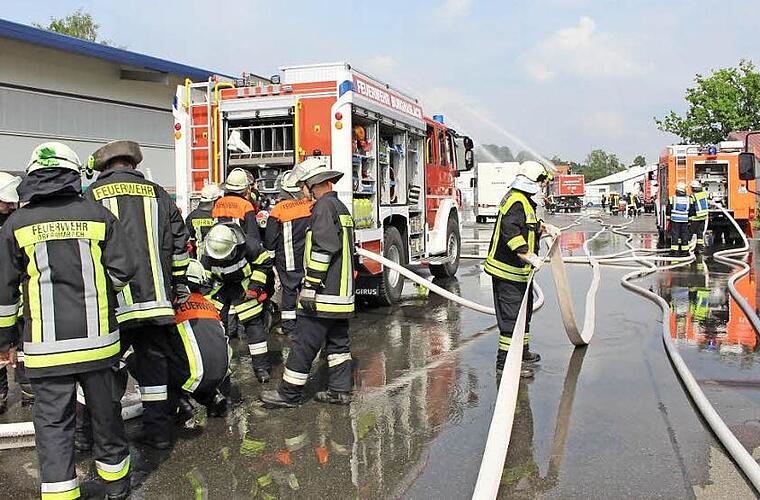 150 Feuerwehrleute aus den Gemeinden Schlüsselfeld, Burghaslach und Geiselwind beweisen beim Reisemobilhersteller Concorde in Aschbach, dass sie für den Ernstfall gerüstet sind.