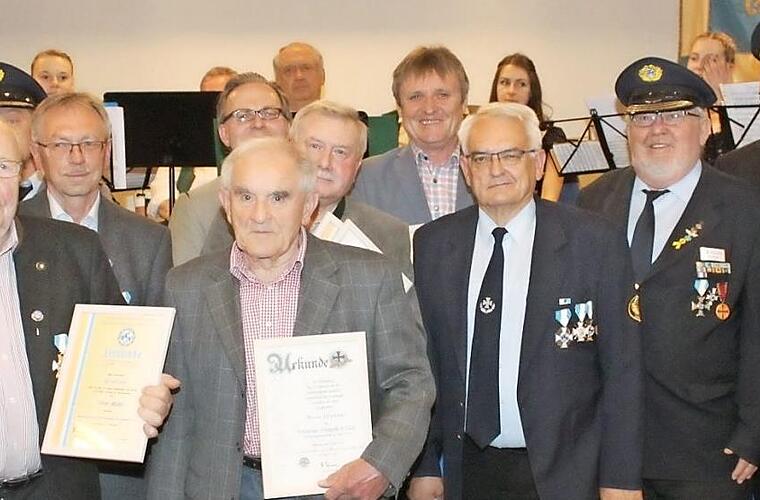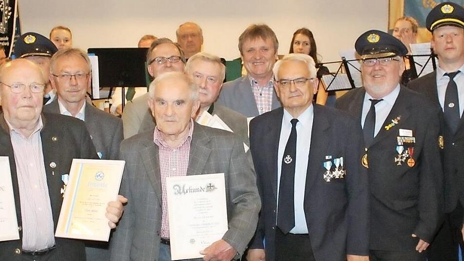 Der 81-jährige Alfred Geck zum Beispiel wurde für 60 Jahre Vereinszugehörigkeit geehrt und erhielt zusätzlich das Ehrenkreuz am weißblauen Band in Gold verliehen. "Ich war erst Panzerfahrer bei der Bundeswehr und bin danach in den Kriegerverein eingetreten", erzählte Geck. Das sei aus Überzeugung gewesen. "Die Geschlossenheit hat mich begeistert, und dass viele ältere Herren dabei waren, mit denen man sich gut unterhalten konnte", erinnerte er sich; und auch daran, dass er zehn Mark im Monat verdient und alleine die Monatskarte für den Bus zur Arbeit nach Wiesenthau 5,20 Mark gekostet hatte. Der 80-jährige Franz Drummer war Fallschirmspringer bei der Bundeswehr. "Ja, das brauchte schon Schneid, um da rauszuspringen. Und wer zögerte, der bekam von hinten einen Schubs", erzählte Drummer lachend. Er stammt vom Gasthaus Drummer, dem Vereinslokal des Vereins, so war es Ehrensache, dass er nach der Bundeswehr Mitglied wurde. Das war vor 60 Jahren.