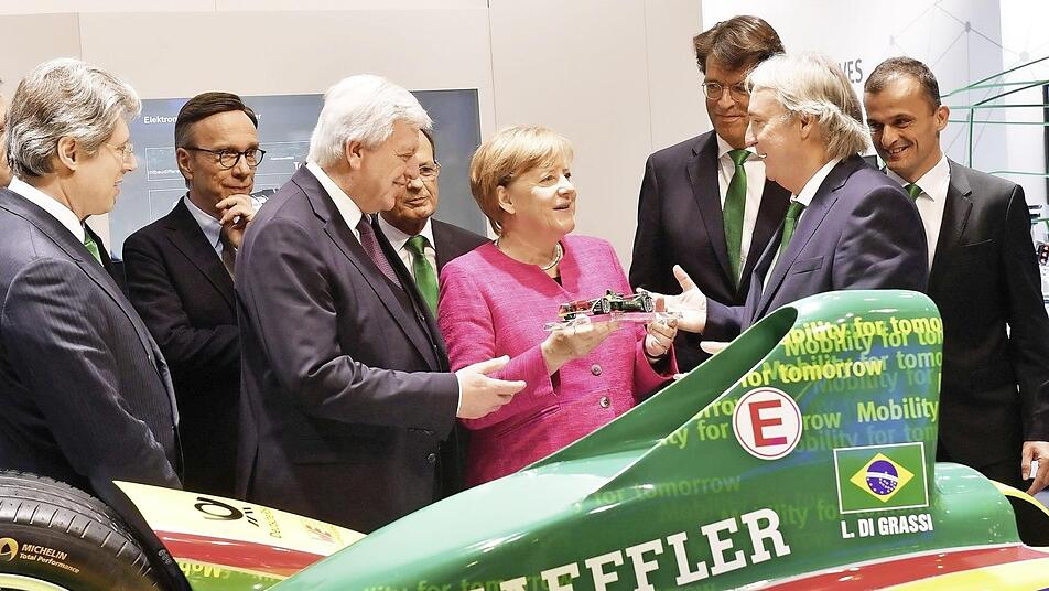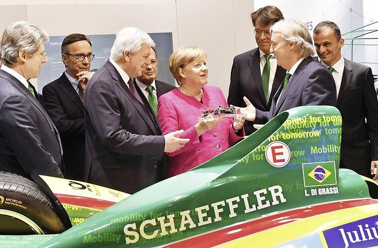 Gesellschafter Georg F. W. Schaeffler hat Angela Merkel auf dem Schaeffler-Messestand auf der Internationalen Automobilausstellung (IAA) begrüßt. Gemeinsam mit Klaus Rosenfeld, Vorstandsvorsitzender der Schaeffler AG, und Matthias Zink, Vorstand Automotive, begleitete er die Kanzlerin ein Stück auf ihrem offiziellen Messerundgang.