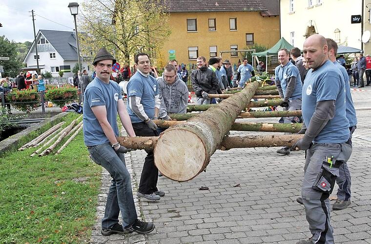 "Wir haben keinen kleineren gefunden", scherzten die Kerwasburschen. Einen 30 Meter langen Baum hatten sie im Gemeindewald gefällt.