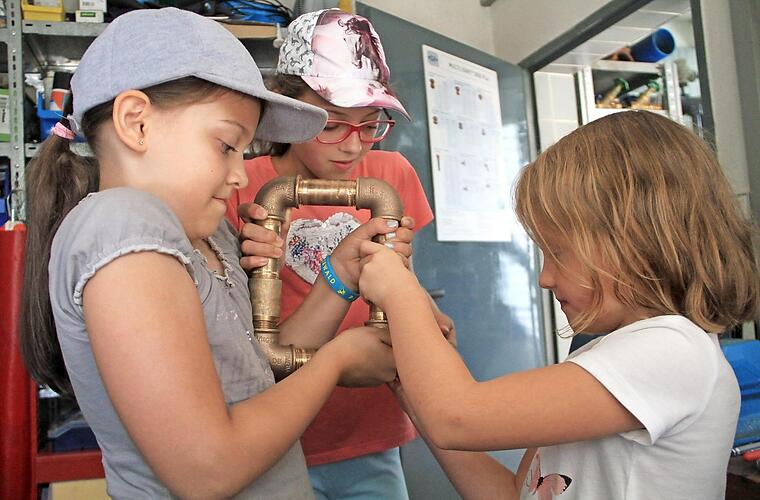 Fünf Mädchen und Jungen wollten einmal wissen, woher das Wasser aus der Leitung kommt, wenn sie den Wasserhahn aufdrehen. Die Besichtigung der Wasserversorgung im Rahmen des Ferienprogramms führt zunächst zum Tiefbrunnen der Gemeinde. Die innere Schutzzone ist nur für die Mitarbeiter der Gemeinde zugänglich. "Wenn sich jemand unbefugt auf dem Gelände aufhält, dann bekommen wir das mit", sagt Stefan Reutter. Das Gelände ist nämlich alarmgesichert. Viel ist hier nicht zu sehen, dennoch hat der gemeindliche Wasserwart so seine Aufgaben. "Die Betriebsstunden werden jede Woche notiert", erklärt Reuther. Emilie darf ihm dabei helfen und die Zahlen ablesen. Die nächste Station ist das Wasserhaus der Gemeinde. Wie schon am Tiefbrunnen ist auch hier alles alarmgesichert. Nach der Hitze des Tages ist es hier angenehm kühl. "Was ihr hier in Ebensfeld zu trinken bekommt, das kommt alles von hier", erklärt Reutter. Damit werden nicht nur die Haushalte im Gemeindegebiet versorgt (bis auf einige wenige, die ans FWO-Netz angeschlossen sind), sondern auch die Schule, die öffentlichen Grünflächen, einfach alles. Bis Nachmittag sind bereits 69 Kubikmeter aus dem Tiefbrunnen in den Hochbehälter gelaufen", erklärt der Wasserwart. Um den Kindern einen Eindruck von der Zahl zu geben, nimmt Reutter einen Vergleich. 69 Kubikmeter sind etwa 460 Badewannen voll. "So oft kann sich ein Mensch am Tag doch gar nicht baden", lautet der spontane Kommentar eines Kindes. Das im Ebensfelder Wasser enthaltene Eisen-Mangan wird mit Hilfe von vielen, vielen kleinen Glaskügelchen herausgefiltert. Aus einem Regal nimmt Reutter zwei Tassen und füllt sie mit Wasser. In einer befindet sich ungefiltertes Wasser, in der anderen gefiltertes Wasser. Trinken kann man beides. Im Keller des Wasserhauses liegt der Verdüsungsraum, in dem dem Wasser Sauerstoff zugesetzt wird. Von da geht es in den Hochbehälter und wird bei Bedarf ins Ortsnetz abgegeben. Auf dem Fußboden hat Reutter eine Reihe von Wasseruhren aufgereiht. Darunter ganz alte und ihre Nachfolgermodelle. "Im Dezember, wenn ihr der Mama oder dem Papa beim Ablesen der Wasseruhr helfen wollt, immer nur die schwarzen Zahlen ablesen". Im Anschluss dürfen die Kinder dann mit den Dingen umgehen, die unter anderen den Alltag von Reuter und seinen Kollegen prägen. Sie sollen Wasserrohrstücke unterschiedlicher Zollstärken mit den entsprechenden Verbindungsstücken zusammenbauen. Alle Kinder sind mit Eifer dabei. Danach, am Treffpunkt vor dem Rathaus, warten nicht nur die Mamas auf die Kinder, sondern auch ein leckeres Eis.