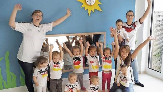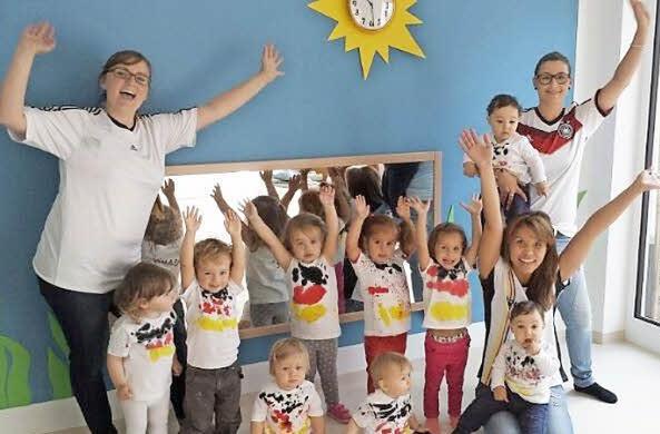 Forchheim — In der Kinderkrippe "Rabbel Zabbel" in Forchheim waren in den letzten Tagen elf Kinder damit beschäftigt, sich ein tolles Deutschland-Trikot selbst zu gestalten. So können selbst die jüngsten mit zehn Monaten mit den Erwachsenen und deren Fußballfieber mithalten. Die Kinderkrippe feiert ihre Nationalmannschaft so oder so. "Wir sind stolz auf Jogis Elf", sagt die Krippenleitung Joanna Schiener (rechts unten). Links die Kinderpflegerin Deborah Safra, rechts oben die Kinderpflegerin Eileen Müller. Foto: privat