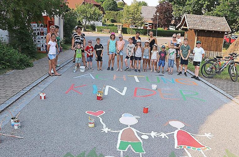 Unter Regie des Obst- und Gartenbauvereins bemalten Kinder den Bereich Vorbacher/ Ruppacher Weg, um Verkehrsteilnehmer zum vorsichtigen Fahren anzuhalten.