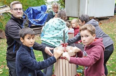 Da nun die Äpfel geerntet sind, war es an der Zeit, die Saftpresse auszuprobieren. Wieder folgten viele Kinder der Einladung und so konnten gemeinsam mit den Kindergruppenleiterinnen Julia Welsch und Theresia Groh über 20 Liter selbst gepresster Apfelsaft hergestellt werden. Die Kinder schnitten und häckselten eifrig körbeweise Äpfel mit Hilfe von Julia Welsch und Theresia Groh und einigen (Groß-)Eltern. Die zerkleinerten Früchte wurden schließlich in die neue Saftpresse eingefüllt und los ging es mit kräftig Drehen. So konnten die Kinder lernen, wie Apfelsaft entsteht, und dabei mitwirken. Am Ende durften alle Kinder stolz ihren eigenen frisch gepressten Saft mit nach Hause nehmen. red