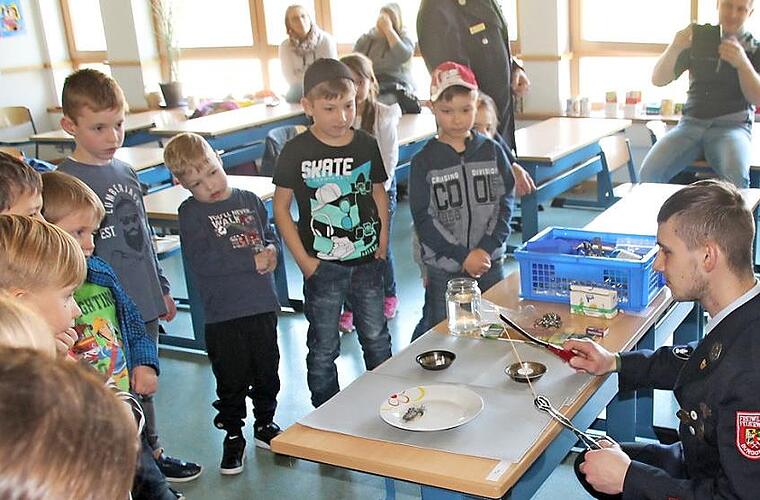 Zum Abschluss des Lehrgangs waren alle gefordert. An einer realen Brandschutzerziehung an der Grundschule Rodachtal nahmen über 45 Kinder und deren Eltern teil. Auch die Eltern drückten freiwillig die Schulbank, um das von ihren Sprösslingen Erlernte ebenfalls vermittelt zu bekommen.