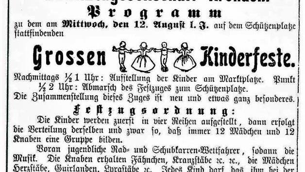 Das Kronacher Freischießen hat eine lange Tradition und ist nun bereits 430 Jahre alt. Und seit über 110 Jahren nimmt das beliebte Kinderfest einen hohen Stellenwert im Festverlauf in der Lucas-Cranach-Stadt ein. Bestes Beispiel dafür ist die aussagestarke Anzeige in der seinerzeitigen Tageszeitung "Fränkischer Wald" vom 9. August 1908.