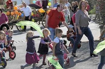 Beim Umzug fuhren die Kindergartenkinder mit ihren kleinen Fahrzeugen vorneweg. Am neuen Domizil angekommen, übergab Bürgermeister Torsten Gunselmann den rund eine Mil-lion teuren Neubau schließlich seiner Bestimmung. Eine Kindergartengruppe und eine Krippengruppe mit zwölf Plätzen finden dort ihr neues Zuhause. Man hat sich für den Namen "KinderGarten St.