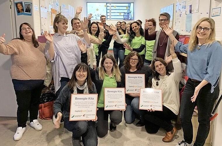 Vier Kindertageseinrichtungen haben sich erneut auf den Weg gemacht, Bewegungskita zu werden: Die Kita "Villa Sonnenschein" aus Adelsdorf, der Kindergarten "St. Marien" aus Bubenreuth, die Kinderkripp...