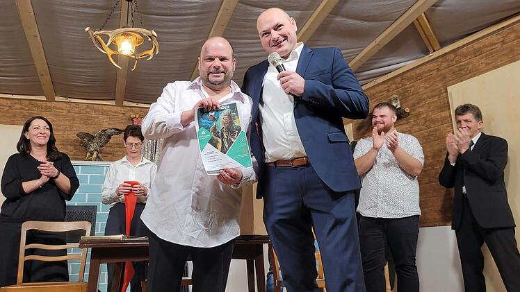 Er ging darauf ein, dass Jochen Seitz mit den 30 Jahren das dienstälteste Mitglied der Theatergruppe ist. Zudem hatte er sich nach der Corona-Zeit auch der Verantwortung als Regisseur gestellt, wofür er mit seiner großen Erfahrung prädestiniert war. Zum Theater war der Abfüllmeister in der Privatbrauerei Kesselring einst mit seinem Kumpel Dirk Albrecht, dessen Vater Horst Albrecht Jahrzehnte Regisseur gewesen war, gekommen. Seitdem ließ ihn die Faszination Volkstheater nicht mehr los und mit gleich gesinnten Frauen und Männern üben sie jedes Jahr mehrere Monate für die Theaterabende. "Man muss sich immer wieder aufraffen, aber wir sind eine gute Truppe und haben Spaß dabei", sagt der 50-Jährige. Sebastian Schneider ehrte Jochen Seitz und beschenkte den Heavy-Metal-Fan mit einem Ticket für ein Konzert von Iron Maiden im Sommer.