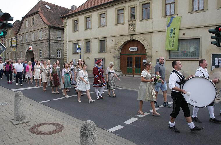 Offiziell wurde es dann am späten Samstagnachmittag im Hof des Zanghauses gleich neben dem Rathaus: Dorthin hatte die Gemeinde zum Weinfestempfang geladen – und dem Ruf von Weinprinzessin Marla I. und Bürgermeister Karl-Dieter Fuchs waren etliche lokale Größen gefolgt. Nach gut einer Stunde Smalltalk und kurzen Reden stellten sich die Gäste auf und machten sich, angeführt von den Retzstadter Musikanten, auf den Weg am Rathaus vorbei an den Main. Dort eröffnete Marla I. ganz offiziell das Weinfest.