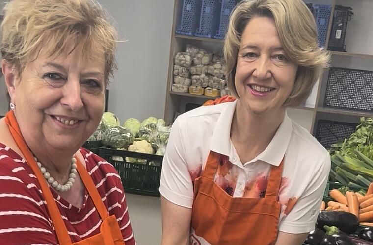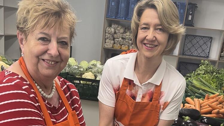 Bei der Kitzinger Tafel half Weisgerber gemeinsam mit der Obervolkacher Bezirksrätin Gerlinde Martin bei der Essenausgabe. Die Kitzinger Tafel unterstützt seit 20 Jahren Bedürftige mit Lebensmittelspenden.