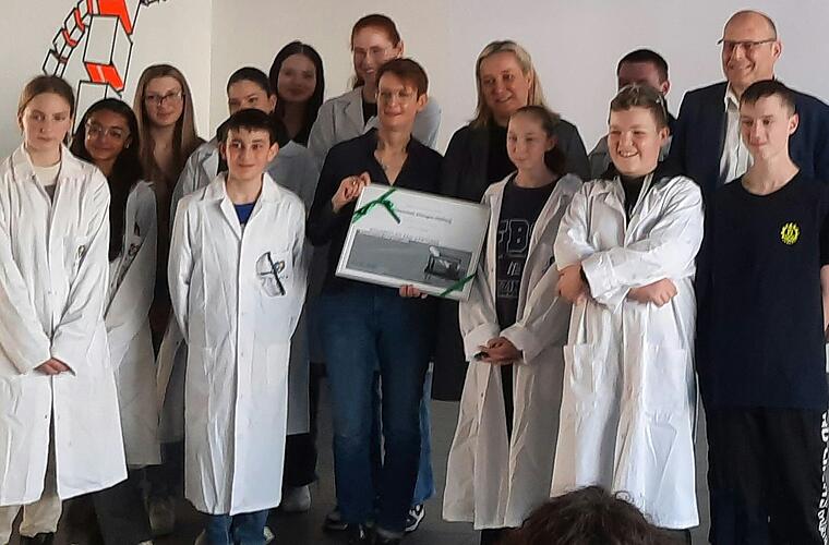 Im Rahmen einer kleinen Feierstunde erhielt die MKS den Förderpreis der Schaeffler FAG Stiftung aus Schweinfurt. Ausgezeichnet wurde das Projekt "Physikanten meets MKS", das im April des letzten Jahres stattfand und dessen Ergebnisse am großen Experimentetag Eltern, Schülern und Gästen vorgestellt wurden. Um einen solchen Preis zu erhalten, mussten bestimmte Kriterien erfüllt sein. So musste der Schwerpunkt eindeutig auf den naturwissenschaftlichen Fächern liegen. Die Teilhabe der ganzen Schulfamilie (Lehrer, Eltern, Schüler) sowie die schulartübergreifende Kooperation mit dem AKG (Fachbereich Chemie) und der Realschule Kitzingen (Fachbereich Physik) waren außerdem ausschlaggebend. Die Präsentation der Ergebnisse am Experimentetag und die Kombination der genannten Kriterien war für die Schaeffler FAG Stiftung überzeugend, so dass sie der Mittelschule Kitzingen-Siedlung dafür einen ersten Preis überreichen konnte. Stellvertretend für alle nahmen Repräsentanten der Schülerschaft und der Lehrkräfte die Urkunde vom Geschäftsführer Herrn Schuster und Frau Feuerbach entgegen. Die Feierstunde endete schließlich mit einem kleinen Imbiss für alle, der unter Beteiligung von Schülerinnen vorbereitet wurde.