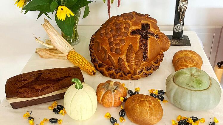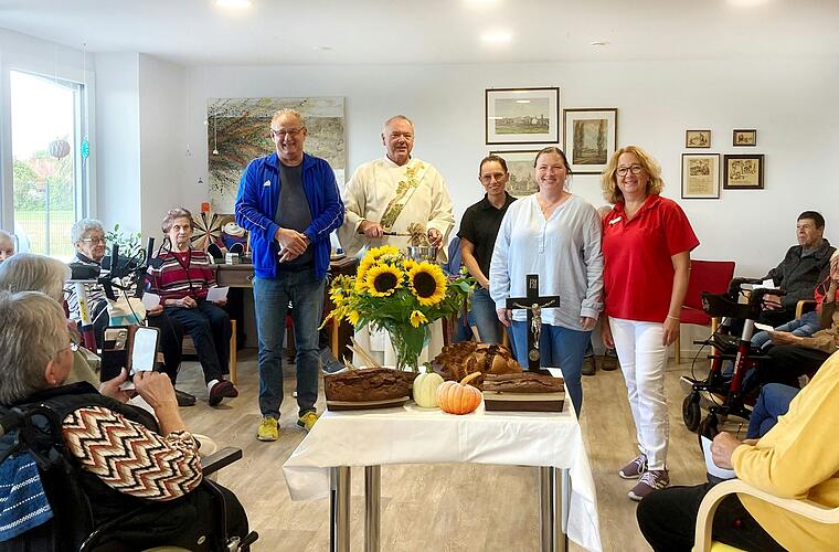 Der große "Tagespflege St. Hedwig – Erntedanklaib" aus Rotkorn, Gelbweizen, Schwarzweizen verziert mit Kreuz, Trauben und Ähren und einem geflochtenen Kranz wurde so zum besonderes Brot. Die einzelnen Zutaten wie auch zum Kuchenbrot symbolisieren was besonders ältere Menschen zum Leben brauchen. Eine gute Mischung aus Selbstständigkeit, soweit mögliche Unterstützung durch Angehörige und soziale Einrichtungen und die Gnade, Hilfe annehmen zuzulassen. "Über diesem Lebens-Brot-Leib der Älteren steht Dankbarkeit", so Diakon Kleinschnitz bei der Segensfeier vor dem wunderschönen Erntegabentisch.