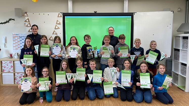 "Fahr nie schneller als dein Schutzengel fliegen kann…" Diesen Wunsch gab die Klassenleiterin Susann Hillgärtner ihren 18 Viertklässlern der Grundschule Willanzheim nach der bestandenen Radfahrprüfung mit auf den Weg. Seit Mitte Dezember wurde fleißig geübt. So konnten nun nach drei Übungseinheiten, einer praktischen und einer theoretischen Prüfung sowie dem Fahren im Realverkehr die Mädchen und Buben in einer Feierstunde ihren ersten Führerschein samt Urkunde und Wimpel in Empfang nehmen. Mit Liedern und verschiedenen, selbst erstellten Gedichten bedankten sich die Kinder bei den beiden Verkehrserzieherinnen der Polizei, Frau Aust und Frau Diener für ihre Geduld und ihr Engagement. Die beiden zeigten anschließend noch einmal in einer eindrucksvollen Demonstration, wie wichtig das Tragen eines Fahrradhelmes ist. Viele Eltern und Großeltern halfen als Streckenposten im Realverkehr, steuerten verschiedenste Leckereien für das kalte Buffet bei und konnten an diesem Vormittag stolz die Übergabe der Führerscheine miterleben.