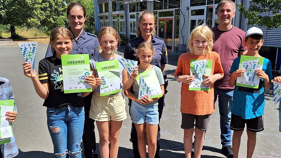 Als letzte Gruppe im Landkreis haben die Volkacher Viertklässler ihre Ausbildung für den Fahrrad-Führerschein absolviert. Mit den Polizeibeamtinnen Sabine Diener und Anne Aust haben sie das korrekte Fahren in der Praxis geübt. Die Lehrkräfte Sabine Huppmann, Franziska Gailing und Silvia Christenn waren für die theoretische Ausbildung zuständig. Folgende Schülerinnen und Schüler konnten sich wegen ihres hervorragenden Abschneidens sogar über die besondere Auszeichnung des Ehrenwimpels freuen: Isa Weingärtner, Amelie Werner, Margareta Druckenbrod, Emma Stephanski, Adam Rietzler, Paul Wächter (alle Klasse 4c), Tim Achtmann (Klasse 4a). Konrektor Markus Reitz gratulierte den Führerschein-Neulingen und bat die Schüler dringend, beim Radfahren immer einen Helm zu tragen. Um diesen Appell zu untermauern, berichteten die beiden Polizeibeamten von schweren Fahrradunfällen aus dem Landkreis, die mit Helm weitaus glimpflicher ausgegangen wären.