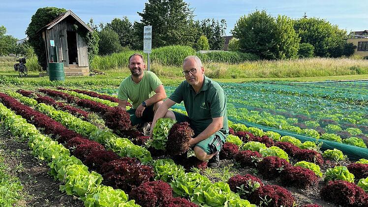 Christian Gräbner und Peter Hummel waren in den vergangenen Wochen fleißig. Neben ihrer Arbeit im eigenen Betrieb haben sie mit Kollegen des Etwashäuser Gartenbauvereins mehrere hundert unterschiedliche Salatsorten und Dutzende Kohlrabi gepflanzt und das Feld in unmittelbarer Nähe des Main-Radwegs und in Sichtweite der B8-Brücke mit einem Netz abgedeckt.