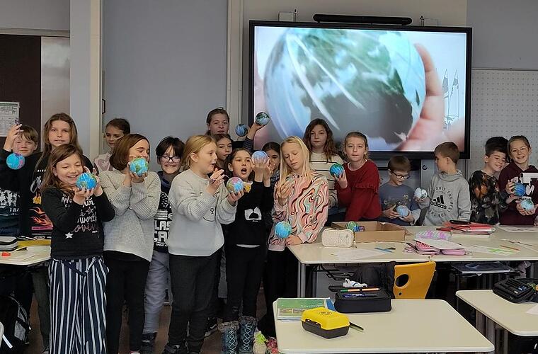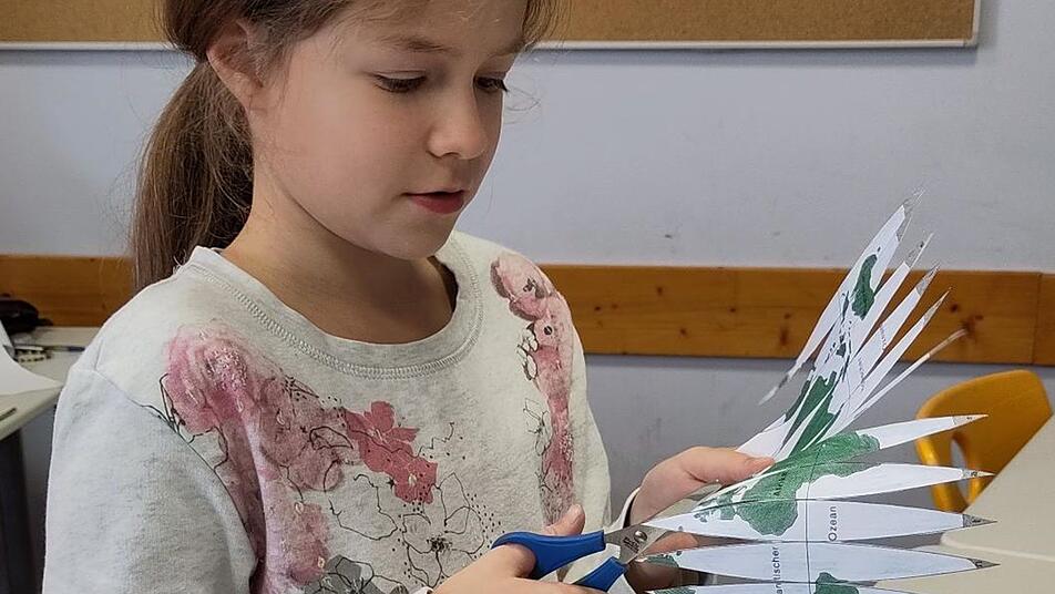 Im Unterricht galt es zu veranschaulichen, dass jede Weltkarte eine große Ungenauigkeit in sich birgt, weil sie die Oberfläche einer Kugel auf ein ebenes Stück Papier projiziert. Daher beklebten die Lernenden eine Styroporkugel mit einem Kartennetz, das die sieben Kontinente der Erde darstellt. Ganz nebenbei wurden beim Ausmalen von Kontinenten und Meeren, dem Ausschneiden des Kartennetzes entlang der Meridiane und dem Bekleben der Kugel feinmotorische Fähigkeiten geübt, die sonst am Gymnasium nur noch in Kunsterziehung trainiert werden. Spaß gemacht hat die Aktion auch, wie man auf den Bildern sieht. Außerdem hat jetzt jedes Kind einen eigenen Globus, der an den Weihnachtsbaum gehängt oder ins Bücherregal gestellt werden kann.