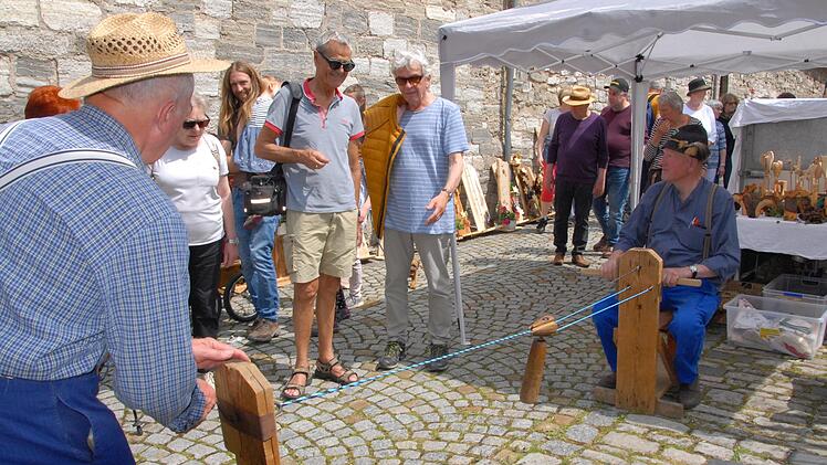 Auf die Finger schauen ließen sich vor Ort Handwerker wie der Sander Korbflechter Stefan Rippstein, ein Weidenflechter, eine Frau an einem Spinnrad und die Klöppelfreunde Langenfeld. Wie man einst Stricke drehte, veranschaulichten der Ochsenfurter Josef Schott und der Ansbacher Fritz Eisemann. In der Kulisse der romantischen Kirchenburg gefiel den Gästen das Stöbern und das Genießen eines Schoppens abseits von Hektik.
