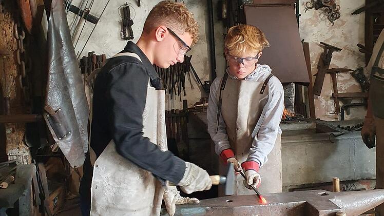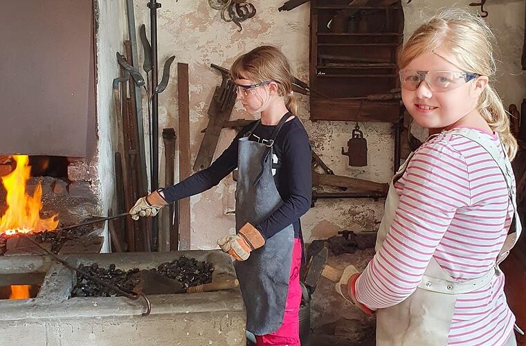 Dass die Zeit sehr unterschiedlich empfunden werden kann, merkten auch die Mädchen und Jungen, die sich für das "Schmieden mit Kindern" angemeldet hatten. Nach einer kurzen Einweisung konnten sie selber an Esse und Amboss arbeiten. Manchmal klappte es wie am Schürchen: Das Eisen hatte die richtige Temperatur, es wurde korrekt auf den Amboss gehalten und der Hammer traf mit der richtigen Kraft am richtigen Punkt. Die Zeit verging wie im Flug. Und manchmal ging es überhaupt nicht voran: Das Eisen wurde nicht heiß oder verbrannte, es wurde falsch gehalten, so dass es sich verbog, der Hammer hatte nicht die richtige Kraft oder traf nicht den vorgesehenen Punkt. – Und die Zeit wurde lang.