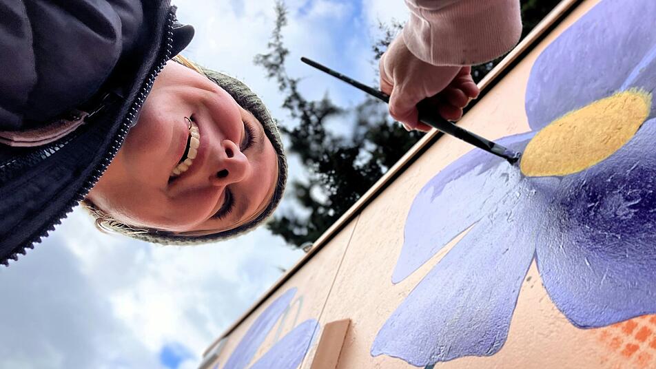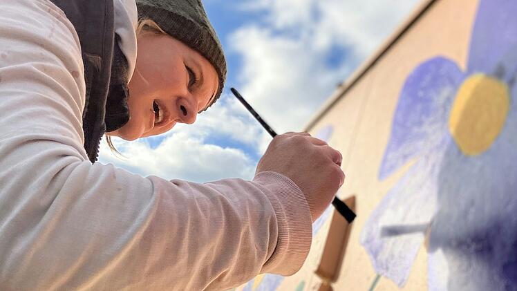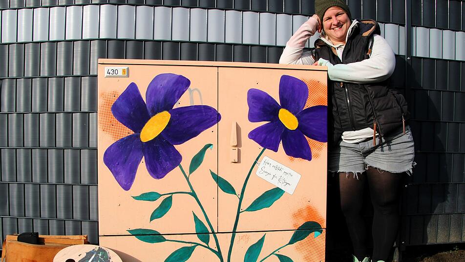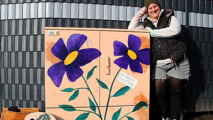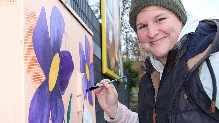 Hinter Künstlerin Jotty steckt die 39-jährige Kitzingerin Judith Rasp, ihres Zeichens "Murel Artist", Wandmalerin. Sie hockt vor einem Stromverteiler-Kasten neben der Kreuzung beim städtischen Bauhof. Auf der Farbpalette in ihrer linken Hand leuchten blaue, violette und türkisgrüne Kleckse. Mit dem Pinsel in ihrer rechten Hand verrührt sie die Farben und trägt ihre Mischungen auf die Türen des Panzerschranks auf. Immer wieder schwingt sie den Pinsel. Am Ende wachsen auf dem orangerot grundierten Stromhäuschen zwei Riesenblumen, deren Blütenblätter rund um einen sonnengelben Kern so brillant glänzen wie Schmetterlingsflügel.