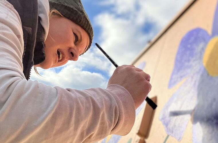 "Ich möchte die Menschen durch meine Kunst wieder mehr mit der Natur verbinden", sagt Jotty, während sie voller Hingabe malt. Die gebürtige Nordrhein-Westfälin hatte in Holland Textilmanagement studiert, Fachrichtung Objekteinrichtung. Danach lebte sie ihr Interesse für Raumausstattung und Innenarchitektur bei einem großen Möbelhaus in Würzburg aus, ehe sie sich als Illustratorin selbstständig machte. Nach Kitzingen kam sie durch ihren Mann Kai Rasp, der hier aufgewachsen ist. "2019 habe ich die Liebe zur Wandmalerei entdeckt, als ich mit rundem Babybauch das Zimmer für unseren heute vierjährigen Sohn gestaltet habe", erzählt Jotty.