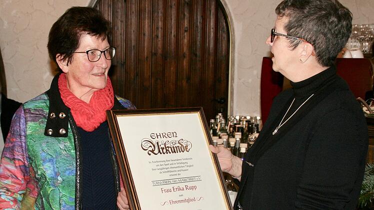 Durch den Abend im Marktbreiter Winzerkeller moderierte die Vereinsvorsitzende Christiane Höfer. Sie begrüßte besonders die Ehrenmitglieder Doris Dahlfeld, Siegfried Kopp und Karl-Heinz Walter. In einer feierlichen Laudatio berichtete sie über Erika Rupps erfolgreichen unermüdlichen Werdegang beim Turnverein Marktbreit, der ihr ganzes Leben prägte und überreichte ihr die große Urkunde der Ehrenmitgliedschaft des Vereins. "Man kann sich den Turnverein ohne ihr Wirken nicht vorstellen", lobte die Vorsitzende. "Erika trat 1956 in den Verein ein und übernahm schon 1956 den Posten der Schriftführerin, war dann zwischenzeitlich Beisitzerin und ist seit 1961 bis heute Schriftführerin und seit 2000 auch zweiter Kassier".