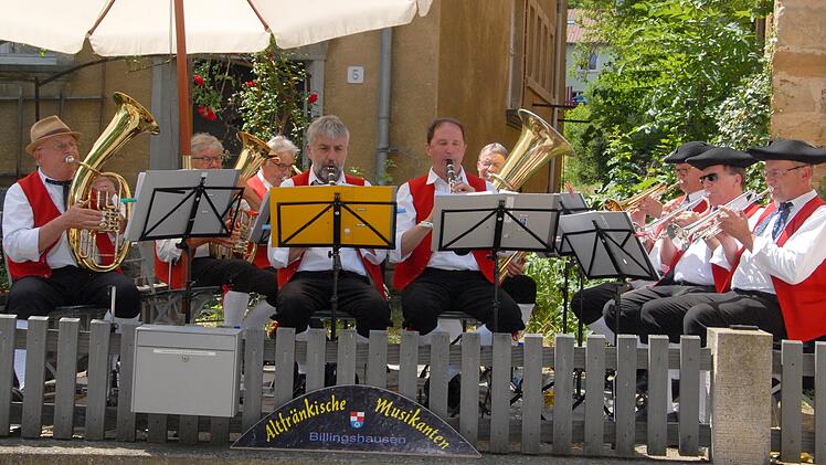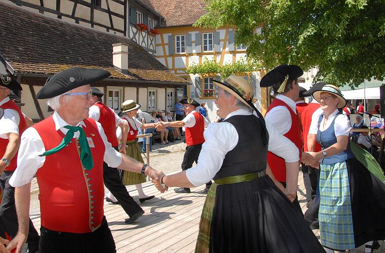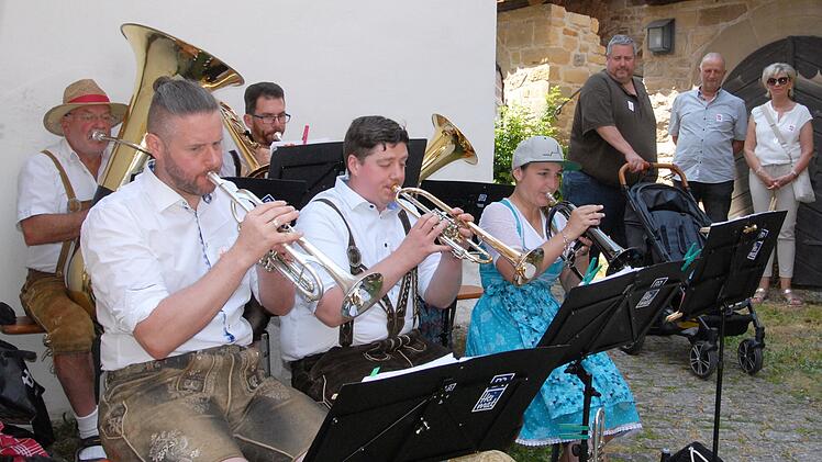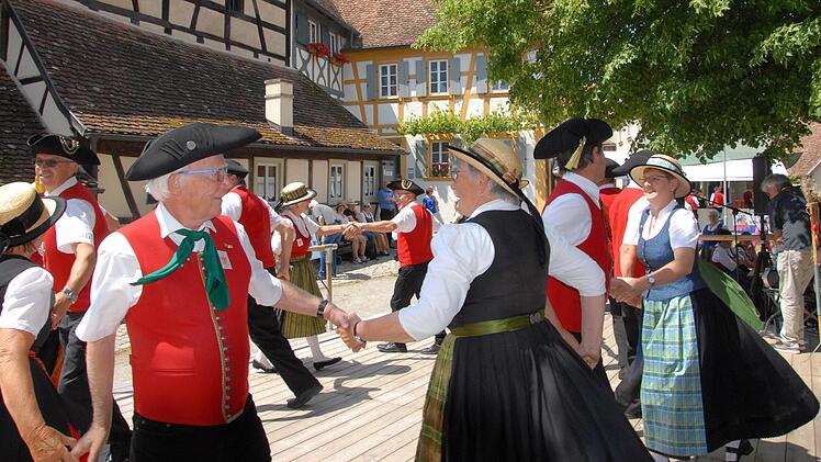 Den Tag eröffneten die Musikanten der Altfränkischen Freunde aus Billingshausen mit Stücken, die ins Ohr gingen. Nach der Eröffnung drangen aus den vielen Gebäudeteilen des Freilandmuseums Klänge unterschiedlicher Ensembles. So sangen im Kräutergarten die Bauersberger Sänger und ein paar Meter weiter im Bauernhof Hahn die Fränkischen Musiker aus Kolitzheim und im Kirchenhof spielten die Wiesenbronner Kärwamusikanten. Derweil schickten sich die Paare der Kürnacher Volkstanzgruppe an, auf der Dorfplatz-Bühne den Besucherinnen und Besuchern mehrere Tänze vorzuführen. Ob singend, musizierend oder tanzend – die Mitwirkenden waren in ihrem Element und manchen Gästen ging die Musik tatsächlich in Kopf und Beine.