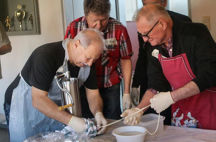 Mit großem Eifer waren die Männersportler bei der Sache und zeigten sich äußerst kreativ. Der Nebenraum der Turnhalle wurde eigens in eine Wurstküche umfunktioniert, um gemeinsam frische Bratwürste zuzubereiten. So wurde nach verschiedenen Rezepten gewürzt, Naturdarm auf das Füllhorn zweier mit Brät gefüllter Wurstfüllmaschinen aufgezogen sowie die lange Bratwurstschlange anschließend per Hand abgedreht.