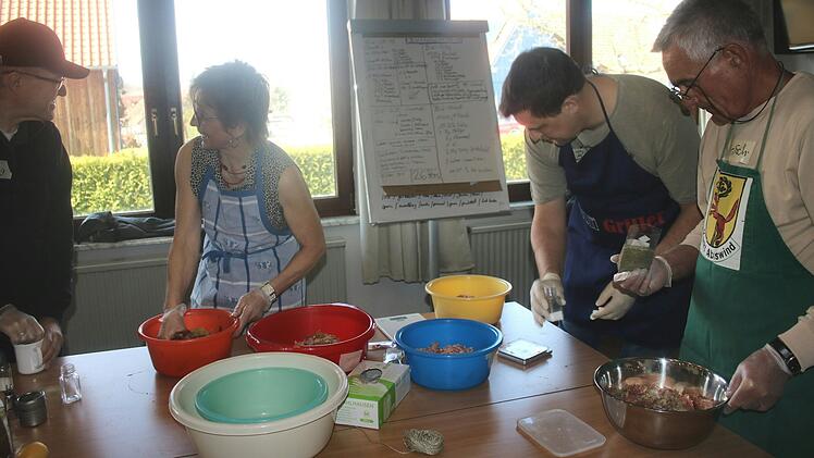 Getreu dem Motto "Frischer geht`s nimmer" war sich die Gruppe einig, in einer Gemeinschaftsaktion Bratwürste in mehreren Varianten selbst herzustellen. Lore Reschke erwies sich auch hier als perfekte Organisatorin, denn sie hatte im Vorfeld dieses Events wirklich an alles gedacht. Fleisch, Gewürze, verschiedene Brotsorten sowie entsprechendes Equipment hatte sie besorgt und durch die Bildung kleiner Arbeitsgruppen die Arbeitsabläufe optimiert.