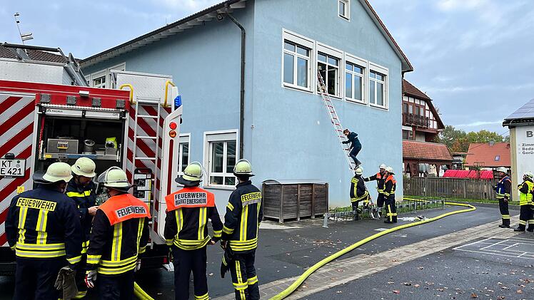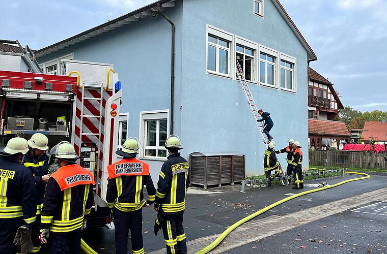 Zum Entsetzen stellte der Schulleiter Matthias Schuhmann bei der Berichterstattung der Lehrerinnen und Lehrer fest, dass zwei Kinder und eine Lehrerin fehlten. Dies wurde umgehend dem Feuerwehrkommandanten mitgeteilt. Sogleich wurden die Feuerwehrleute tätig, suchten mit Atemschutzmasken das Schulhaus ab, und fanden die Gesuchten tatsächlich im Computerraum der Schule. Zum Glück handelte es sich um einen Probealarm und um eine gespielte und vorher abgesprochene Übungssituation. Die Lehrerin Frau Bauer und ihre zwei Schüler wurden von der Feuerwehr aus dem 1. Stockwerk der Schule mit Leiter und Sicherungsseil, unter Beobachtung aller Schulkinder und mit viel Applaus, gerettet.
