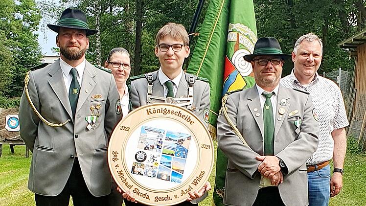 Am Donnerstag, den 25. Mai, trafen sich die Volkacher Schützen bei geselligem Miteinander und leckerer Brotzeit im Schützenhaus, um ihren Schützenkönig für 2023/2024 zu ermitteln. Am Ende konnte sich Axel Wilms vor seinen Rittern Jana und Stefan mit einem 476,7 Teiler durchsetzen. Die Proklamation des diesjährigen Schützenkönigs wurde Fronleichnam am Sommerfest der Königlich privilegierten Schützengesellschaft von 1443 Volkach vorgenommen. Nach der Fronleichnamsprozession, an der die Schützen traditionell mit einer Fahnenabordnung dabei waren, trafen sich die Schützenmitglieder bei warmen Temperaturen, Kaffee/Kuchen, kühlen Getränken und gegrilltem am Schützenhaus zum feiern. Nachdem der erste Hunger gestillt und der Durst gelöscht war, begann der 1. Schützenmeister Andreas Kaltenbach mit der Proklamation. Er bedankte sich beim amtierenden Schützenkönig Michael Skoda und dessen Rittern und proklamierte mit viel lobenden Worten Axel Wilms zum neuen Schützenkönig, indem er Axel die Schützenkette, Schützenscheibe und die Königskrone übergeben ließ. Mit einigen Salutschüssen wurde jetzt der neue Schützenkönig geehrt und die Proklamation beendet. Als gegen Abend der Wind und etwas Regen einsetzte, war ein schönes Sommerfest rasch zu Ende. Axel vertritt jetzt für ein Jahr die Volkacher Schützengesellschaft bei Umzügen und Feierlichkeiten.