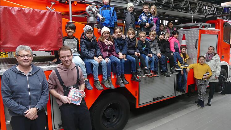 Auf den Besuch der 21 wissbegierigen Kinder hatte sich auch Feuerwehrmann Jonas Wirth vorbereitet. Die Kinder durften auf das Drehleiterfahrzeug klettern, um dem Inhalt der Geschichte möglichst nahe zu sein.