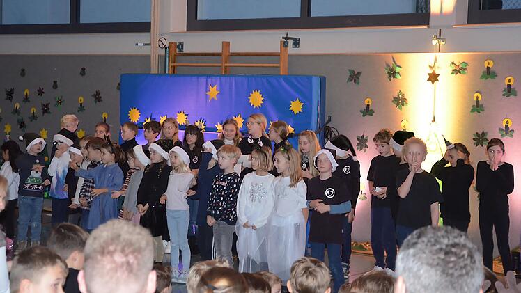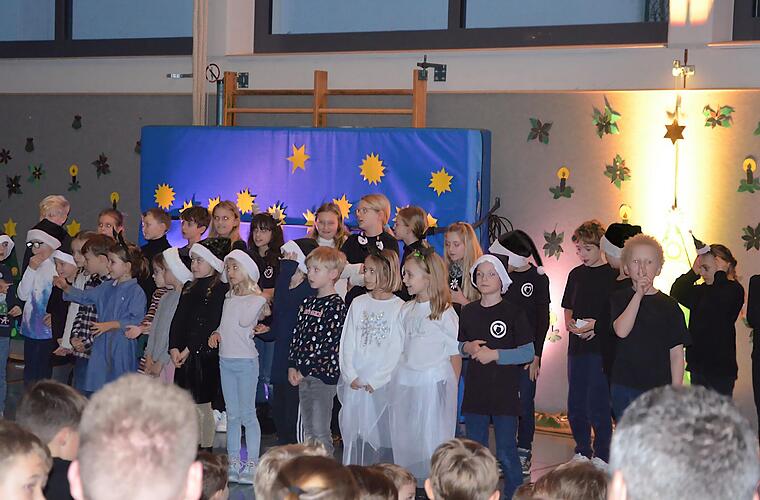 Mit dem Lied "Wenn’s draußen früher dunkel wird" übernahm der Schulchor die Einstimmung. "Du, in unserer Klasse haben sich welche verliebt" … Mit dieser Einleitung sorgten die Erstklässler gleich für Aufmerksamkeit, ehe sie passend zum Fest der Liebe die verliebten Zahlen aus dem Mathematikunterricht vorstellten. Winterlich ging es mit dem Cup-Song "Schneeflöckchen – Weißröckchen" weiter, rhythmisch sicher von der Klasse 2b intoniert. In kreativen Audiopodcasts ließ die Klasse 4a Weihnachtselfen, Wichtel oder Rudolf, the Red nosed Reindeer berichten, wie Weihnachten in Ländern wie Argentinien oder Mexiko gefeiert wird.