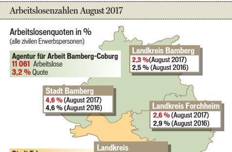 Zum Ende des Berufsausbildungsjahres und Start in die Sommerferien stieg die Arbeitslosigkeit im August naturgemäß wieder an. Im vergangenen Monat hat sich die Zahl der Arbeitslosen im Bezirk der Agentur für Arbeit Bamberg-Coburg im Vergleich zum Juli um 956 auf 11 061 erhöht. Sie ist jedoch mit einem Minus von 751 Arbeitslosen (-6,4 Prozent) in den letzten zwölf Monaten deutlich gesunken, teilt die Behörde mit. Die Arbeitslosenquote erhöhte sich im August um 0,3 Prozentpunkte auf 3,2 Prozent. Vor einem Jahr lag sie noch bei 3,5 Prozent.