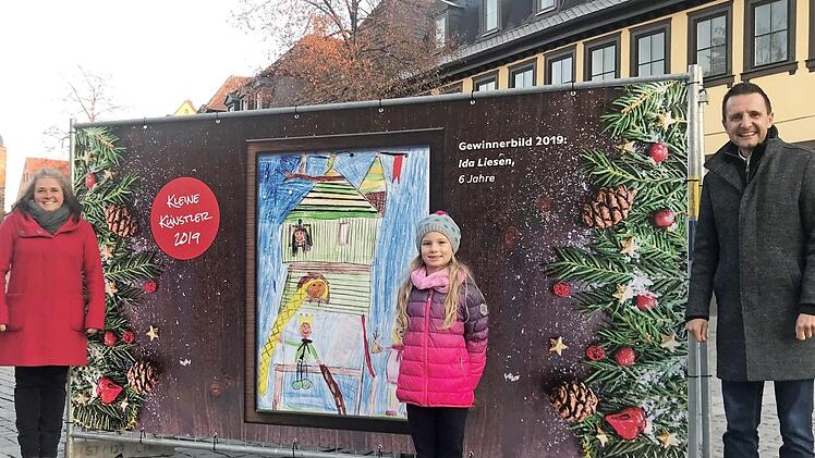 Auch wenn der Weihnachtsmarkt nicht stattfinden kann, so sorgen die überall in der Innenstadt ausgestellten Kinderbilder der Märchenwald-Malwettbewerbe der Stadt dafür, dass Groß und Klein in Weihnachtsstimmung kommen. Unter anderem kann man am Marktplatz, an der Stadtpfarrkirche und gegenüber dem Bahnhof die Märchenwaldeisenbahn, Lebkuchenhäuser oder prächtige Christbäume auf den Bildern entdecken. Kinderaugen erstrahlen lassen sicher auch die zusätzlich aufgestellten Märchenwaldfiguren, wie das Rotkäppchen, der Kalifstorch, das Sterntalermädchen oder der große Zauberer. Auch in diesem Jahr veranstaltet die Stadt wieder einen Malwettbewerb zum Thema Weihnachten. Alle Themen rund um Weihnachten können von den kleinen Künstlern gemalt werden und bis zum 15. Januar an die Stadt Lichtenfels, Bürgermeisteramt, Marktplatz 1, 96215 Lichtenfels, eingesandt werden. Wichtig ist bei der Einsendung, Vorname, Name und Alter sowie Anschrift des Kindes anzugeben. Alle Teilnahmebedingungen gibt's online unter www.lichtenfels.de. Im Bild (von links): Silke Ziegler, Initiatorin des Kindermalwettbewerbs, Ida Liesen, Gewinnerin des Weihnachts-Malwettbewerbs 2019, sowie Bürgermeister Andreas Hügerich vor dem Gewinnerbild, das dieses Jahr die Weihnachtskarte des Bürgermeisters ziert. Foto: Stadt Lichtenfels