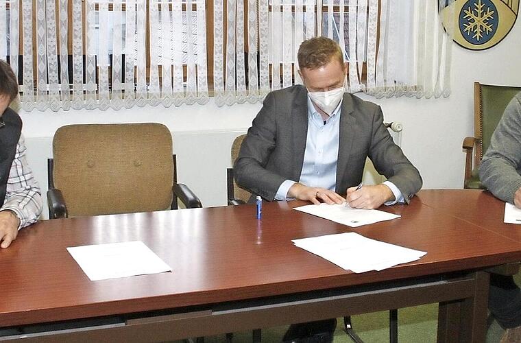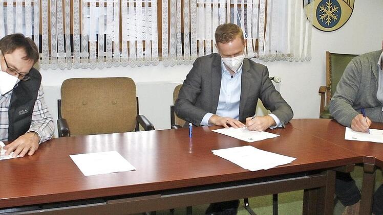 Mit ihrer Unterschrift brachten Bernd Güntzel (CSU), Bürgermeister Bernd Höfer (CSU) und Michael Ehrmann (SPD) (von links) den Umwelt-Fragebogen der Gemeinde Meeder offiziell auf den Weg. Damit will d...