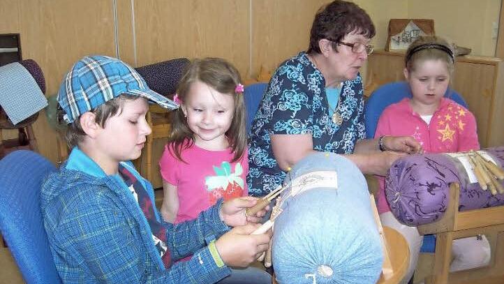 Unter fachkundiger Anleitung der Mitarbeiterin der Klöppelschule Nordhalben, Martina Simon, bewegen die Kinder die spindelförmigen "Spulen". Sie drehen sie geschickt und kreuzen sie übereinander. Die Verbindungen lassen filigrane Handklöppelspitzen entstehen. "Ich hätte nicht gedacht, dass wir das auch können", sind sich die drei einig, während sie voller Stolz ihr Werk betrachten.