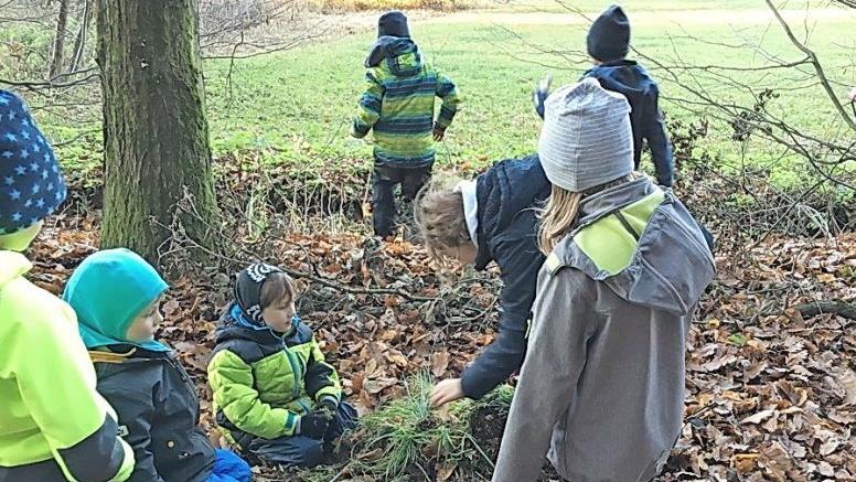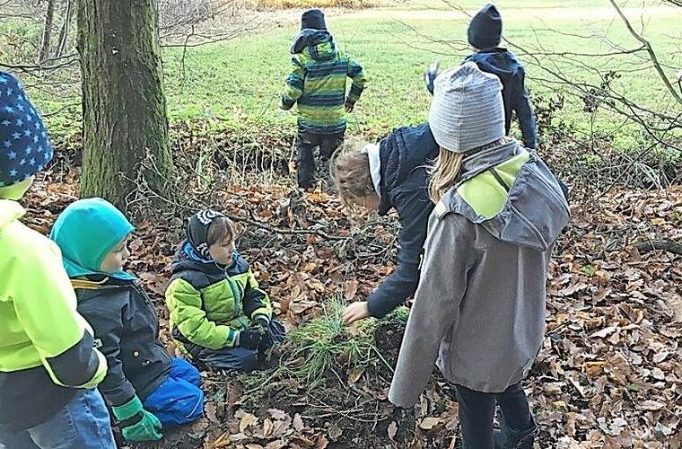 Die Aufgabe der "Löschfrösch" bestand darin, jeweils in ihren Gruppen ein Nest für zwei rohe Eier zu bauen. Das Nest sollte stabil sein und aus Materialien gebaut werden, die der Wald hergibt. Voller Elan kraxelten die Brandlöscher in spe den Waldhang hinauf, um nach entsprechendem Material Ausschau zu halten. Eifrig wurde allerhand Nützliches gesammelt und zusammengetragen. Mit viel Spaß und Freude wurden - teilweise auf dem Hosenboden hinunterrutschend - Moos, alte Baumrinde und kleine Stöckchen befördert. Die Kinder kamen sogar auf die Idee, Matsch aus dem Bach zu holen, um darin die Eier "einzupacken".