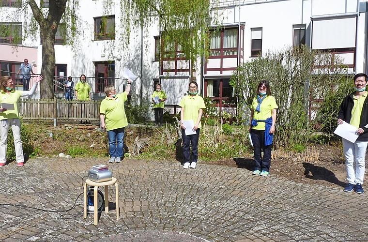 Deswegen haben sich die Mitarbeiter der Sozialen Betreuung eine Alternative überlegt, heißt es in einem Pressebericht der Einrichtung. Immer Mittwochnachmittag singen sie ein Ständchen an mehreren Stellen im Außenbereich des Altenheims, teils mit Gitarren- oder Trompetenklängen, und manchmal begleitet der Koch Mario Brauns die Aktion mit seinem Akkordeon. Da öffnen sich die Fenster und von den Balkonen wird kräftig mitgesungen. "Lustig ist das Zigeunerleben", "Marina", "Mendocino" oder "Wenn alle Brünnlein fließen" sind altbekannte Lieder, die Erinnerungen wecken und beim Volkslied "Die Gedanken sind frei" ist so mancher besonders berührt. Die Botschaft lautet: "Gemeinsam schaffen wir es durch diese schwierige Zeit."