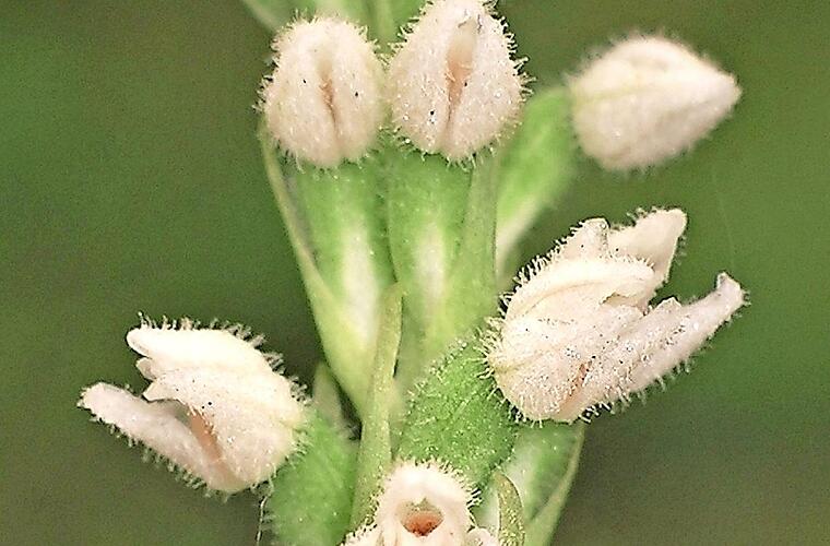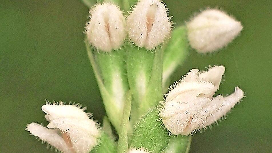 Das Kriechende Netzblatt steht bei uns je nach Witterungsverhältnissen von Ende Juni bis Ende Juli in Blüte. Die nur zirka acht Millimeter großen, weißen bis zart elfenbeinfarbenen Blüten sind fein, aber dicht behaart, ein wahres Meisterstück an Filigranarbeit, wie Adolf Riechelmann in seinem Buch "Orchideen im Naturpark Fränkische Schweiz" (Hg: Naturpark Fränkische Schweiz) schreibt.