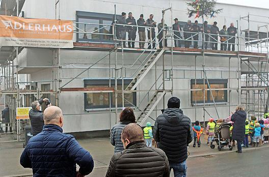 Knapp über 60 Jahre hat die alte Werkstatt der Firma Adler ihre Dienste geleistet, jetzt wurde sie abgerissen und an gleicher Stelle mit Adlerhaus Bemusterungs- und Ideenwelt wieder errichtet. Im Beisein von Ehrengästen, Nachbarn, Baufirmen und den Kindern das katholischen Kindergartens feierte man nunmehr das Richtfest.