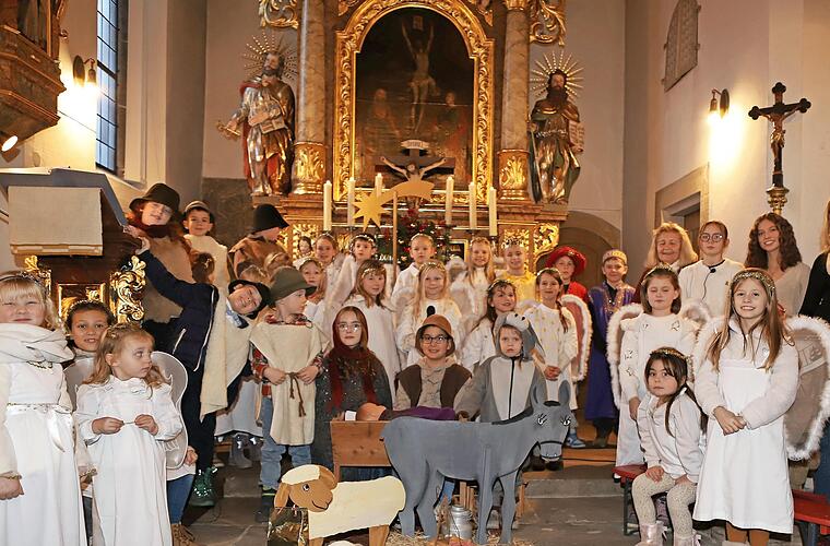 Insgesamt 32 Kinder hatten unter der Leitung von Hermine Fiedler sechs Wochen lang fleißig geprobt. „Wo geht’s denn hier nach Bethlehem?“, fragten die drei Könige. Der Guten-Morgen-Engel, der Geschenke-Engel, der Strick-Engel, der Lichter-Engel, der Flöten-Engel, der Sternen-Engel und der Gute-Nacht-Engel halfen ihnen bei der Suche.