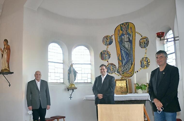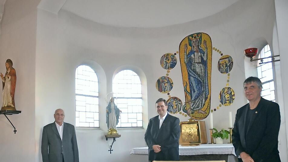 Im Januar 1950 begann der Abriss der alten Kapelle. Es dauerte bis 1955, um alle bürokratischen Hürden zu nehmen und die behördlichen Genehmigungen zu bekommen. Am 25. Juli 1955 erfolgte der erste Spatenstich. Am 7. Oktober 1956, also vor 65 Jahren, wurde die Einweihung des Kirchleins, damals mit Teilnahme von über 1000 Gläubigen, so ist der Chronik zu entnehmen, und einem Pontifikalamt von Weihbischof Landgraf, gefeiert. Die Rosenkranzkönigin und Gottes Mutter Maria wurde zur Patronin der Kirche auserkoren.