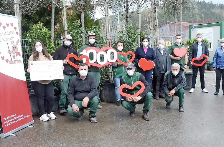 Die Spendenübergabe erfolgte im Beisein der Mitarbeiter und von Bürgermeisterin Angela Hofmann. Die Bürgermeisterin ist zugleich auch Schirmherrin der Benefizaktion und dankte der Familie Berisha mit ihrem Mitarbeiterteam für die stattliche Spende. Die Baumschule Berisha besteht nun schon fast 20 Jahre und hat sich in der Stadt Kronach und im Landkreis Kronach einen guten Namen erarbeitet. Wenn dann noch ein soziales Herz schlägt, ist das eine besondere Auszeichnung für ein kleines Unternehmen und verdiene Respekt und Anerkennung. Hofmann dankte auch dem ehrenamtlichen Team von „1000 Herzen für Kronach“, das sich seit fast 20 Jahren um hilfsbedürftige , finanziell schwächere Menschen in unserer Heimat kümmern und dadurch vielen Familien schon so manche Unannehmlichkeiten wie Stromabschaltung oder kalte Wohnungen im Winter vermeiden helfen konnten. eh