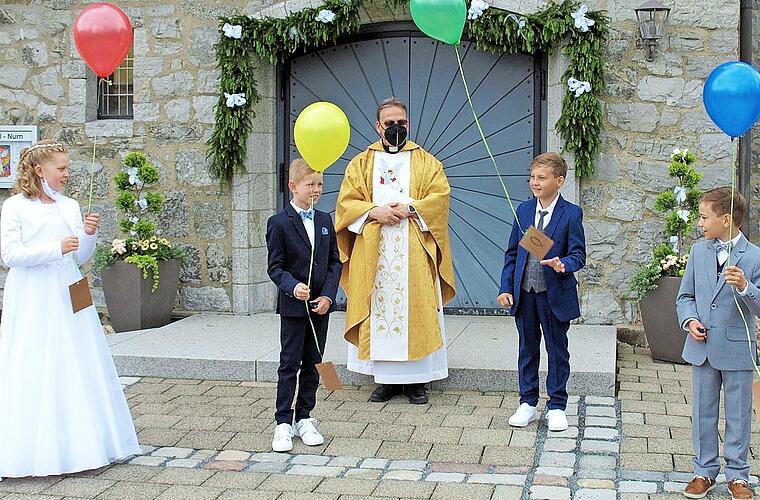 Nach dem Gottesdienst ließen die Kommunionkinder als Zeichen der Freude bunte Luftballons mit Karten und dem Fischsymbol in den Himmel steigen. Die Kommunionkinder, die in Nurn zur ersten heiligen Kommunion gingen, sind Moritz Förtsch, Marie Wunder, Felix Deuerling und Kilian Beierlorzer (Steinwiesen). sd