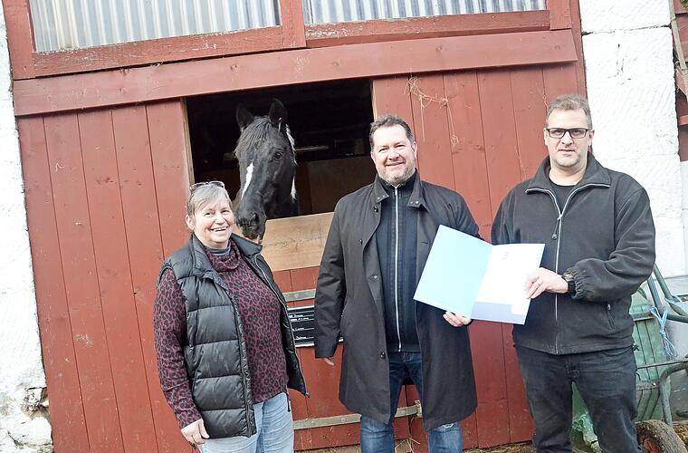 Der Förderverein für Reiten , Tiere & Therapie ist dem Bayerischen Landessportverband (BLSV) beigetreten. Kreisvorsitzender Mario Schmid freute sich, Vorsitzendem Matthias Kelle die Mitgliedschaftsurkunde überreichen zu können.