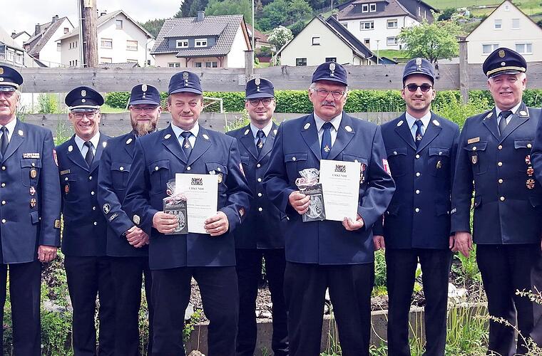 Die beiden ehemaligen Führungskräfte der Wehr, Günter Dormann und Werner Söllner, wurden für ihren 40-jährigen aktiven Dienst mit dem staatlichen Ehrenzeichen in Gold bedacht. Günter Dormann war von 1987 bis 1993 Erster Kommandant und ist seitdem bis heute Beisitzer und Kassenprüfer. Werner Söllner war von 1981 bis 1992 Gerätewart, von 1993 bis 1998 Beisitzer sowie Zweiter Kommandant von 1999 bis 2011.